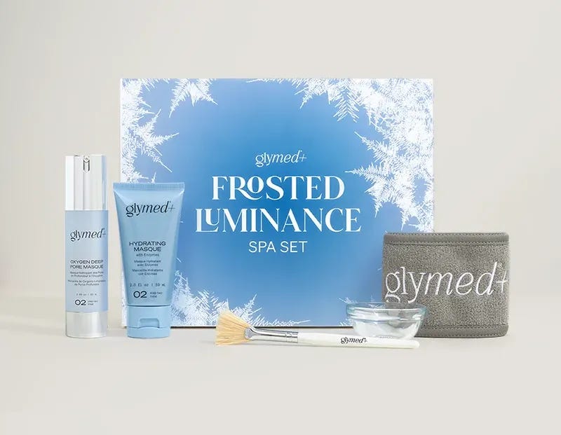 Who says you can’t have a luxury spa experience at home? The Frosted Luminence Spa Set provides just that — with the firming and detoxifying Hydrating Masque with enzymes, and the congestion-clearing Oxygen Deep Pore Masque. Enhance your evening of pampering with a branded spa headband and fan brush for smooth product application.