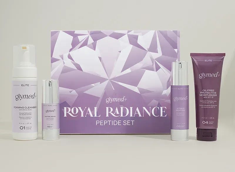 The Royal Radiance Peptide Set includes Elite favorites such as the Atraxi Peptide Serum (which enhances cell turnover to sloooow down the aging process), Foaming Cleanser with Amino Acids, another barrier-repairing Peptide Serum, and the Oil-Free Protective Moisturizer SPF 15.